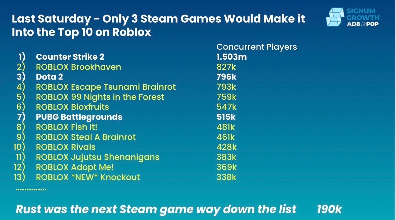We have seen firsthand how UGC platforms empower developers to succeed and create fun games at increasing rates. In an industry facing widespread layoffs and uncertainty, we see UGC as a vital lifeline for developers who want to continue making AAA games as traditional game studios shrink. It is now about reaching audiences where they already are, and as we demonstrated on February 26, 2026, only 3 Steam games would make it into the top 10 on Roblox.