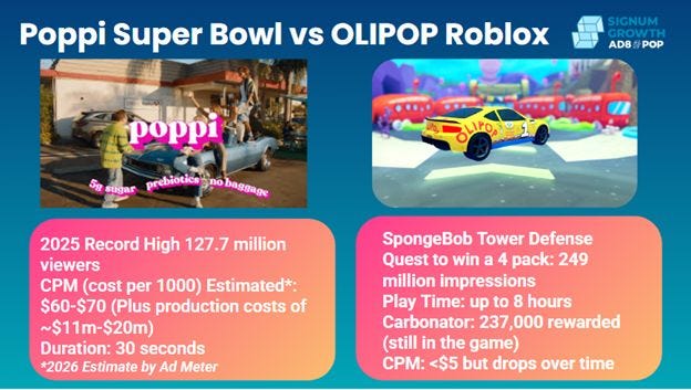 To demonstrate this, we recently did an analysis comparing the cost of a 2025 Poppi Super Bowl ad to our OLIPOP ad in SpongeBob Tower Defense with Wonder Works Studio.